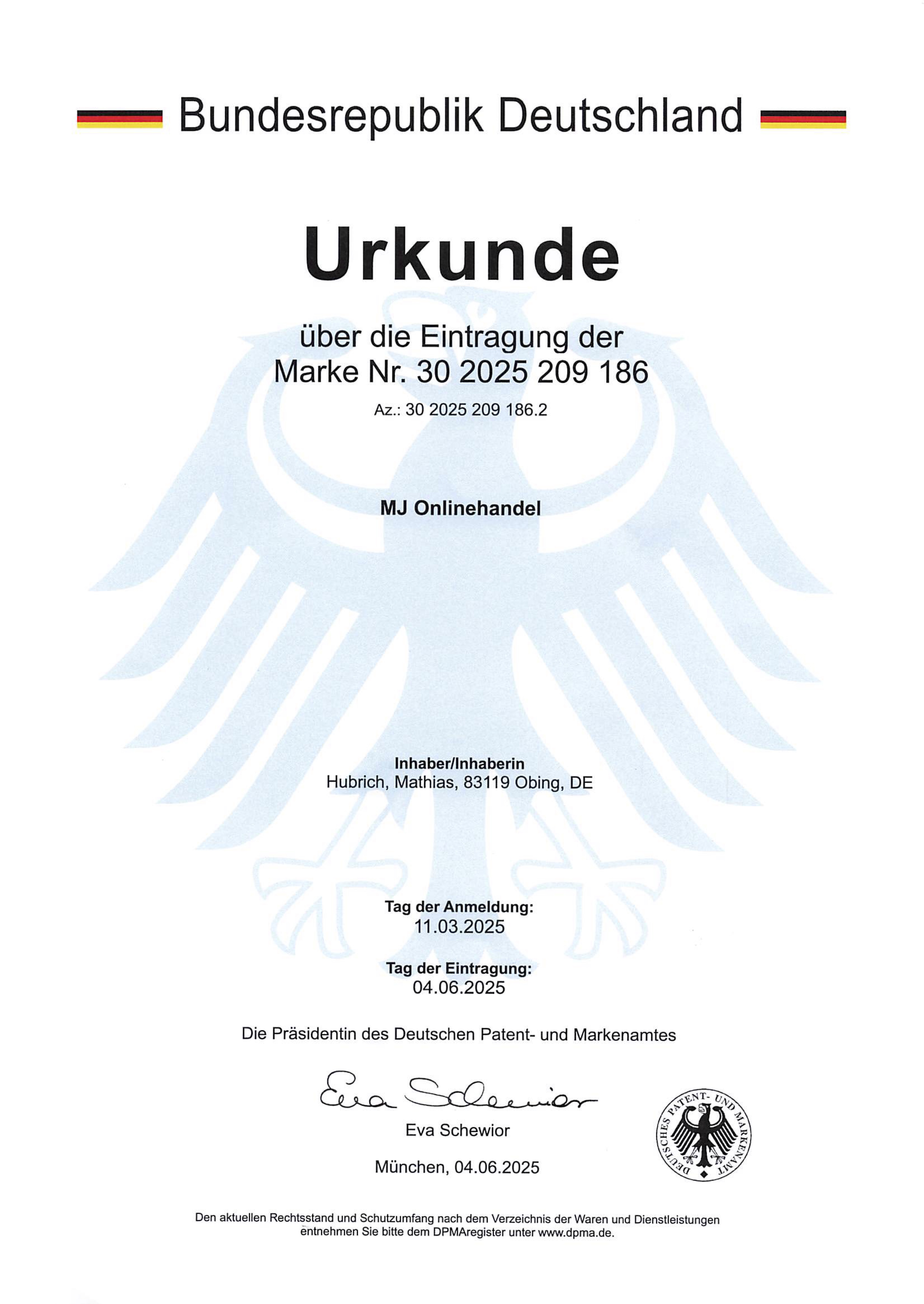 MJ Onlinehandel, Inhaber: Mathias M Hubrich, Haiming 12, 83119 Obing, Deutschland.